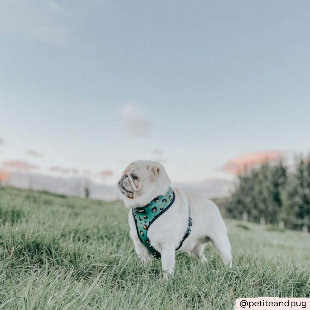Our Adjustable Neck harnesses provide a comfy and stylish alternative to collars. Slide over your pup's head, adjust at the neck and chest, fasten at the side and you'll be "walkies" ready!